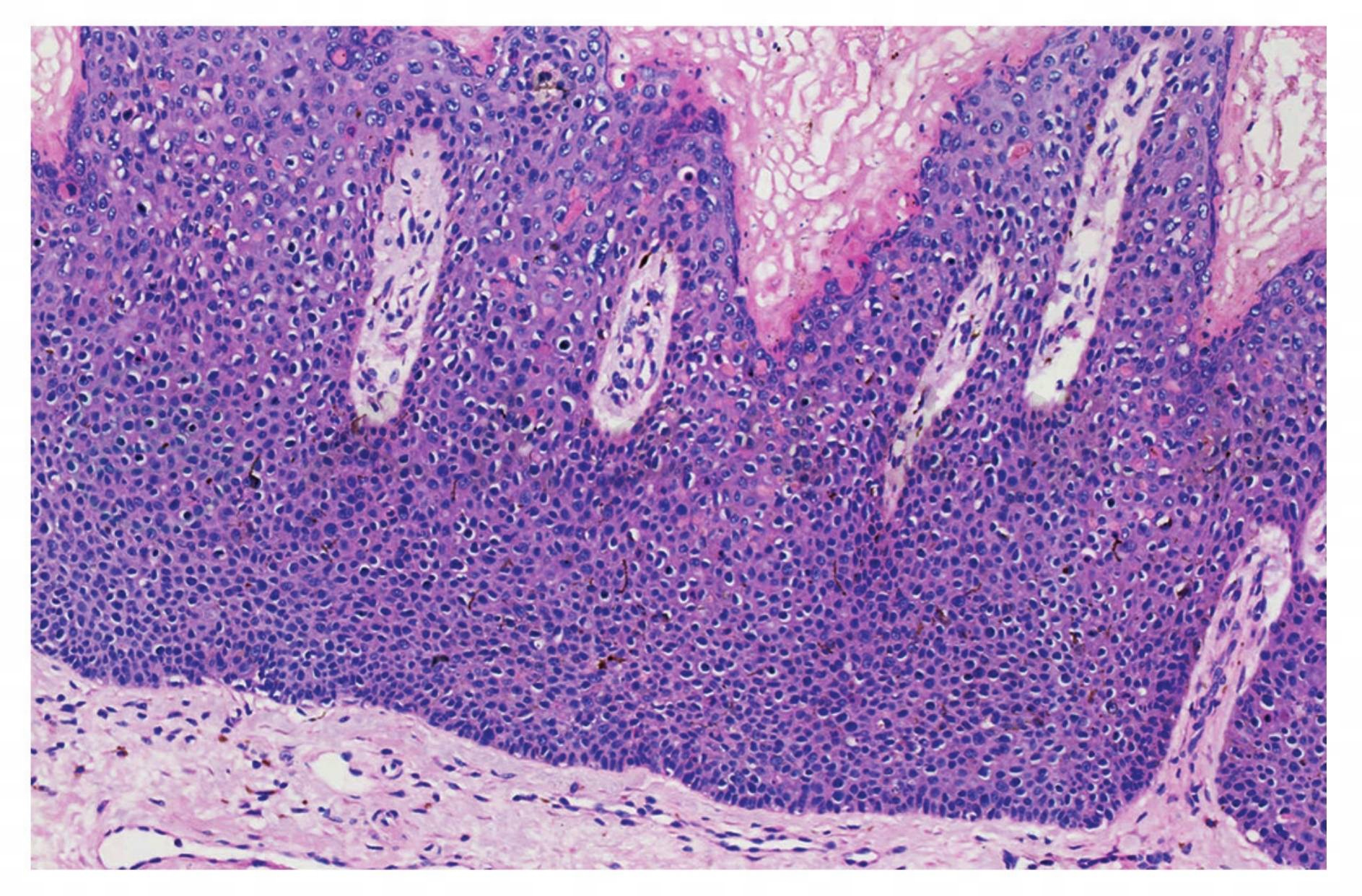 图2鲍恩样丘疹病。棘层内细胞排列紊乱,有异型性(HE染色,×200)