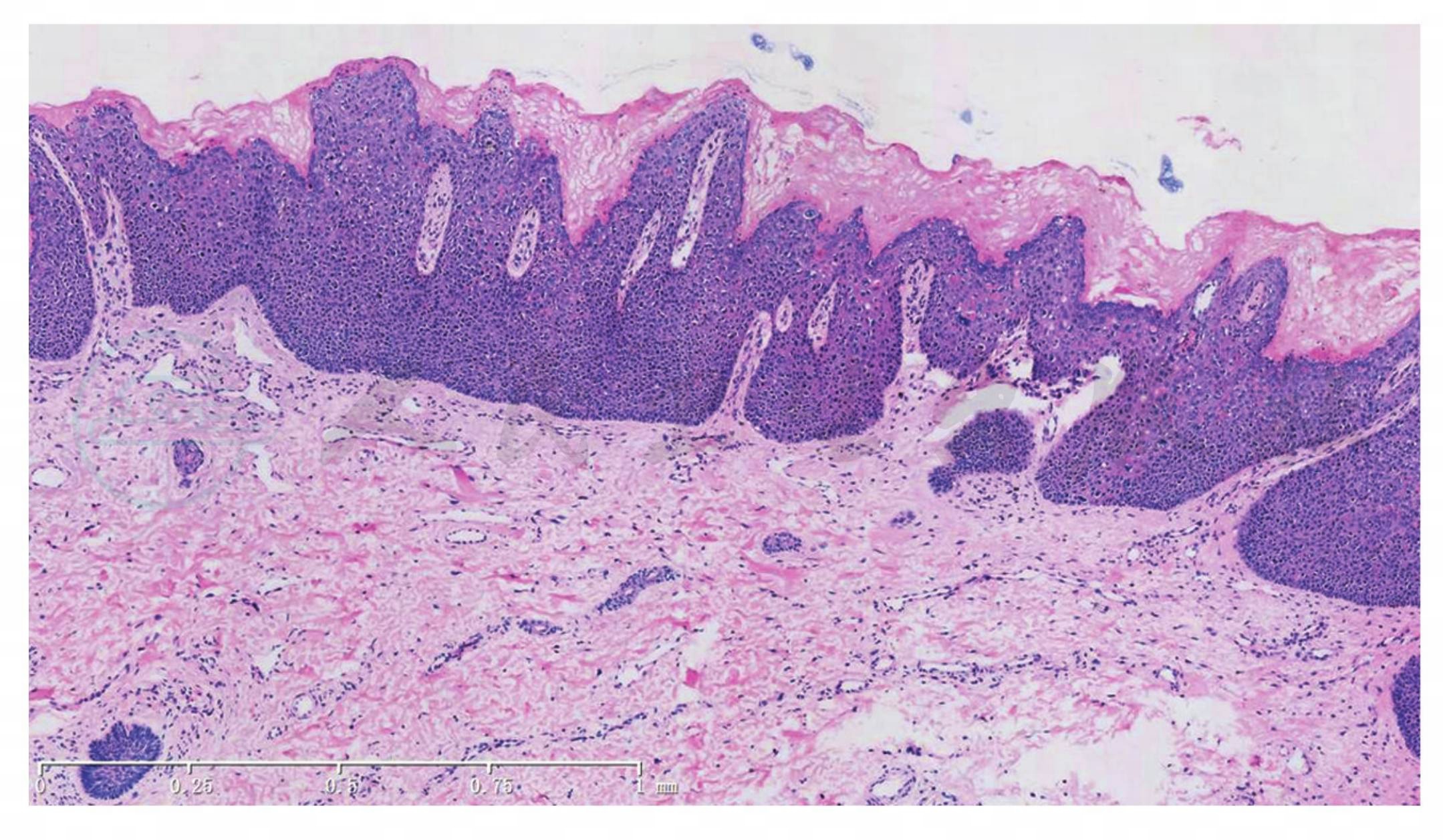 图1鲍恩样丘疹病。表皮乳头瘤样增生,棘层增厚,细胞排列紊乱(HE染色,×100)