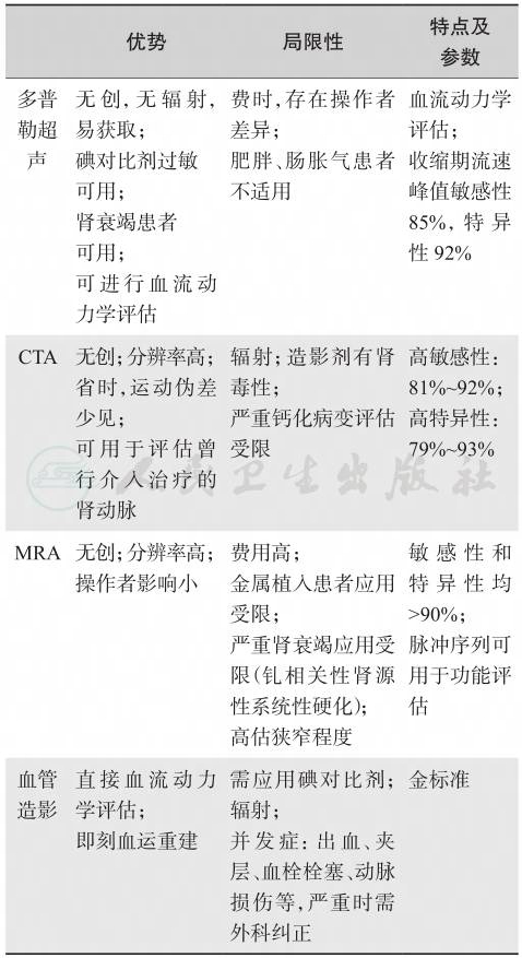 彩色多普勒超声(首选)、计算机断层扫描血管显像(CTA)和磁共振动脉成像(MRA)。当临床上高度怀疑而无创检查难以确诊时,可应用血管造影来确诊RAS。各种检查手段的优缺点见表1。