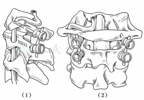 治疗:可以采用颅骨牵引或Glisson枕颌带牵引,2~3周后再上头颈胸石膏固定。对诊断明确的横韧带完全断裂以及顽固性和陈旧性半脱位,可在复位后行寰枢椎融合术。后路寰枢椎融合术最多采用的术式早期主要有Gallie法及Brooks法,即在寰椎后弓与枢椎椎板后方中线植骨和后路椎板钩或钢丝环扎法,目前这种方法由于不融合率较高而逐渐被淘汰。近年来寰枢椎固定方法主要有:寰枢椎间经过关节突的螺钉固定(Margel螺钉技术);寰椎侧块或椎弓根螺钉,枢椎椎弓根螺钉或椎板钉之间的钉棒系统。1987年Margel最早提出了C1/2经关节突螺钉技术,穿过寰枢关节多层皮质,结合Brooks法或改良Gallie法固定寰枢椎,固定可靠(图1)。但手术难度较大,存在损伤椎动脉的风险。目前使用最为广泛的是C1侧块或椎弓根螺钉结合C2椎弓根螺钉固定技术。2001年Harms提出寰椎侧块螺钉技术,以C1、C2侧块关节作为确定进钉点的解剖标志,螺钉垂直于冠状面或轻度内斜进钉,在矢状面的进钉角度平行于寰椎后弓(图2)。Resnick等最先提出寰椎椎弓根螺钉。进钉点在枢椎峡部中央的正上方与寰椎后弓上下缘中央的交点(图3)。如果枢椎椎弓根过细,或横突孔过大,椎动脉畸形等不能进行枢椎椎弓根螺钉固定,可以运用椎板螺钉技术进行固定。这项技术最早2004年由Wright提出(图4)。