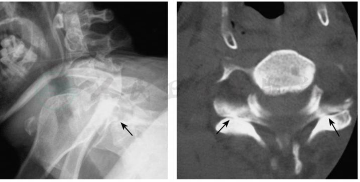 X线侧位片上损伤节段椎体前移的距离至少是椎体前后径的1/2,上位椎体的下关节突位于下位椎体上关节突的顶部或前方,棘突间的距离加大。正位片上钩椎关节关系紊乱,小关节相互关系显示不清。CT可显示典型的双侧小关节脱位征,CT和MRI还有助于鉴别双侧还是单侧脱位。