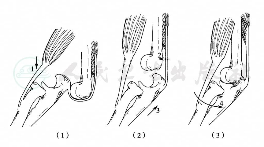 (1)顺畸形方向牵引前臂;(2)当鹰嘴到达肱骨远端时,向前推肱骨远端,向后上推前臂;(3)固定在大于90°屈曲位