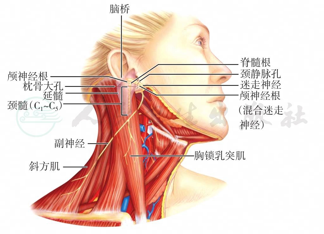 4.肿瘤浸润或压迫:如颈部淋巴结结核、颈部恶性肿瘤可致副神经段颅外段损伤;枕骨大孔区及桥小脑角区肿瘤可致颈静脉孔段及颅内段损伤等。