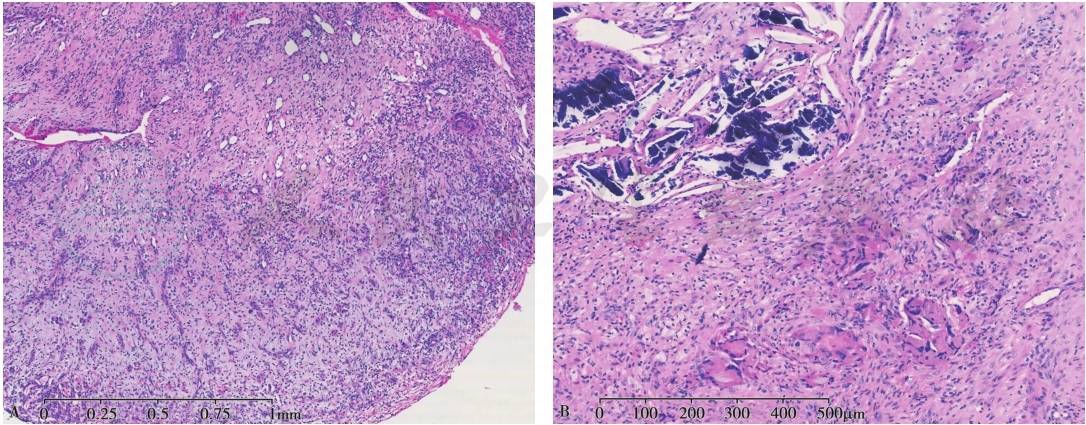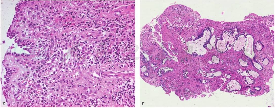 A.肉芽组织增生;B.深部可见钙化、纤维化及异物性多核巨细胞反应;C.黏膜内纤维血管组织增生,伴慢性炎症细胞浸润,部分区间质水肿,可见黏膜被覆上皮下陷形成腺性包涵体;D.息肉表面可见乳头状增生;E.间质内浸润炎症细胞以浆细胞及淋巴细胞为主;F.陈旧息肉内间质纤维化及较多腺性包涵体