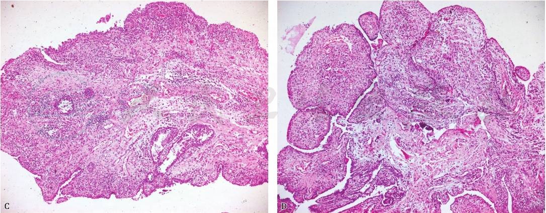 主要为炎性肉芽组织。间质水肿、富含毛细血管,或呈纤维性、毛细血管减少。细胞成分为慢性炎细胞,包括淋巴细胞、浆细胞、组织细胞及嗜酸性粒细胞,或有淋巴滤泡形成,也可见中性粒细胞、Rusell小体、Mott细胞(含大的嗜酸性免疫球蛋白小体)。有时伴多核巨细胞、胆固醇肉芽肿及钙化灶。慢性病例的间质内可见腺性包涵体(图1)。
