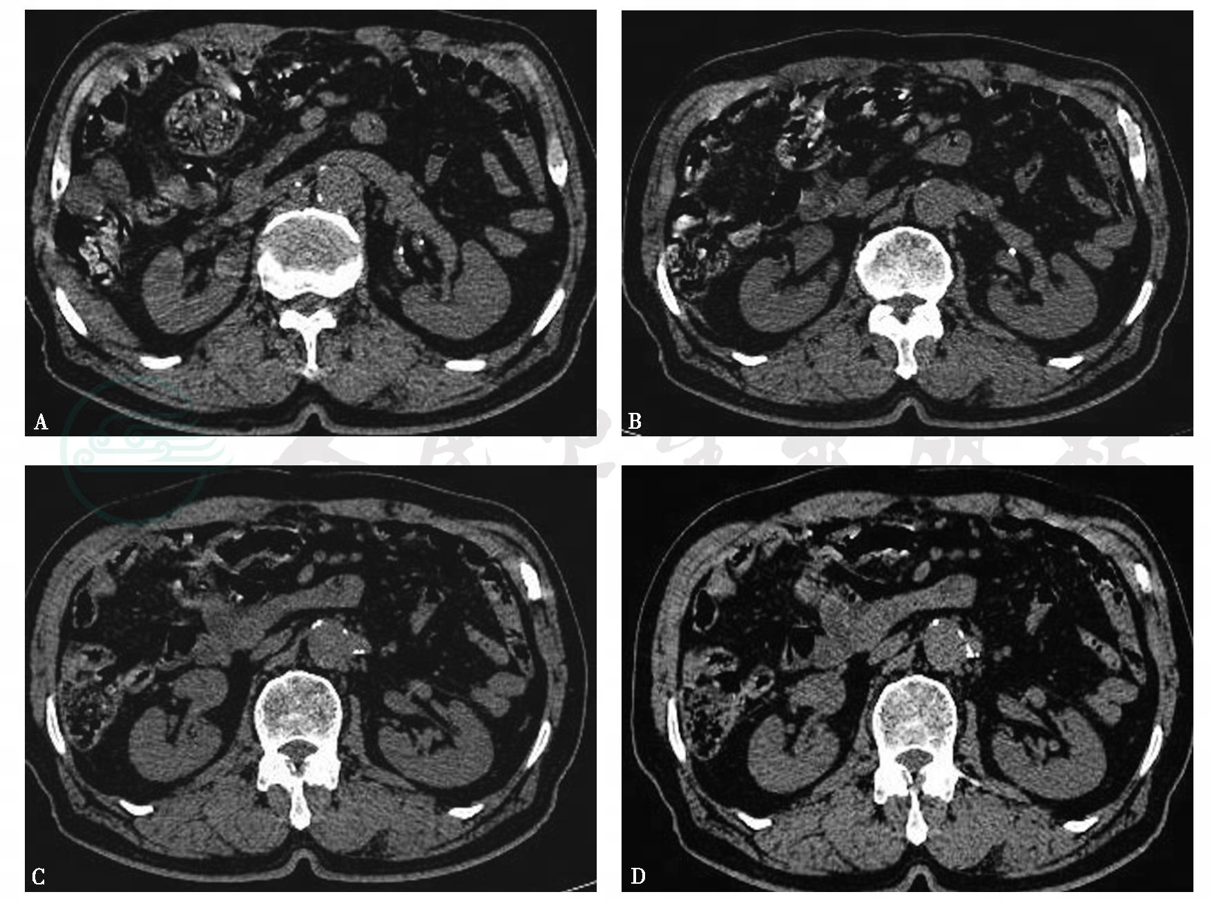 A~D.左肾动脉起始处及肾门处血管壁可见多发点状高密度影,边缘清晰