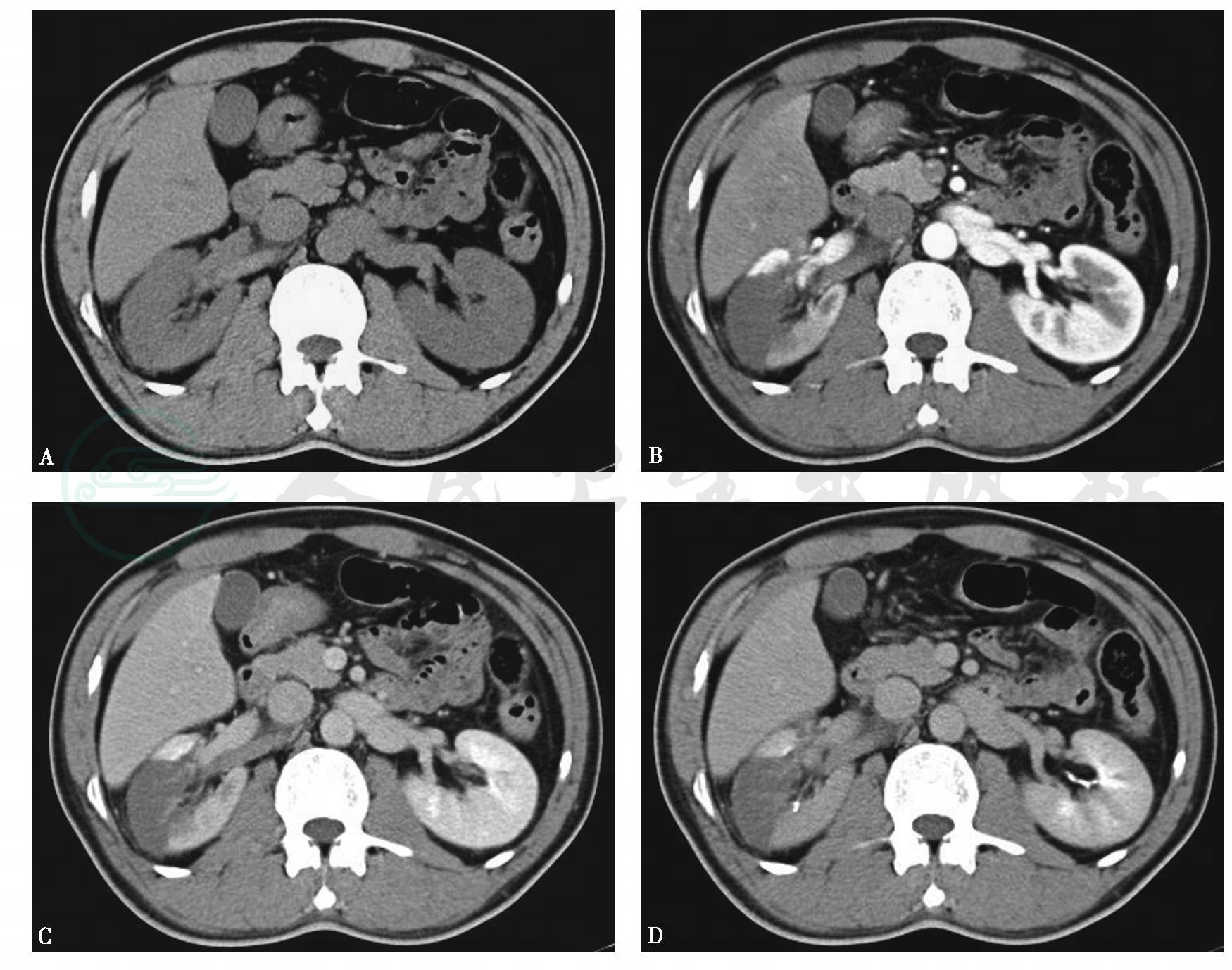 A.平扫,右肾动脉增粗,密度增高,呈白血管征,同侧肾周可见条状密度增高影;B~D.增强,右肾中部可见扇形无强化区,尖指向肾窦,肾动脉内可见充盈缺损