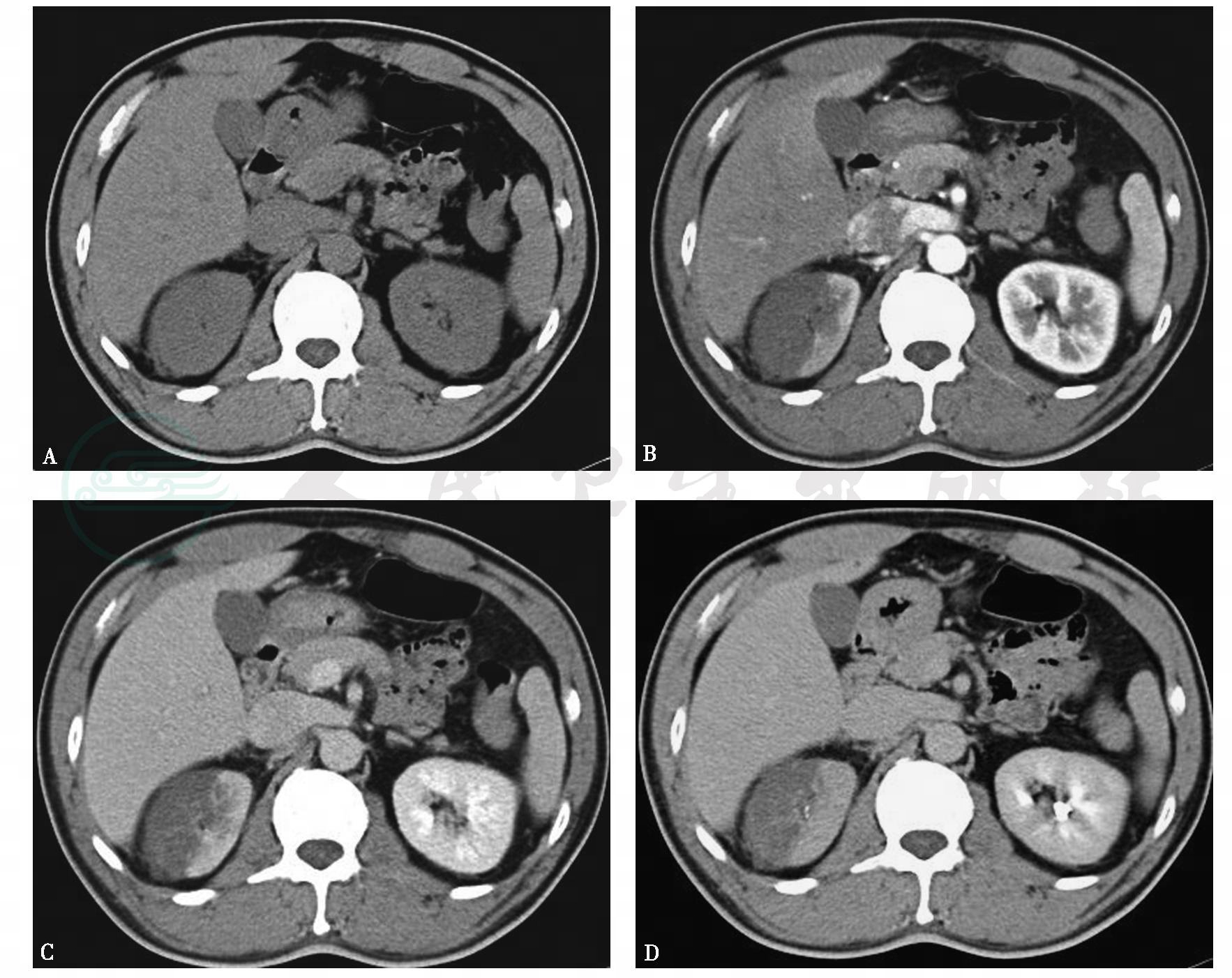 A.平扫,双肾形态、大小、密度尚可,右肾周可见条状等密度影;B~D.增强,右肾上极可见扇形无强化区,尖指向肾窦