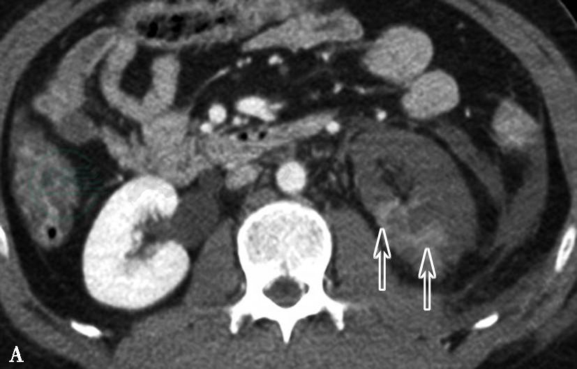 CT平扫的表现与肾梗死的范围、检查时间相关。早期肾梗死灶由于与正常肾实质缺少密度差异,CT平扫肾脏密度多无明显异常改变,部分可以显示肾脏体积增大,肾周脂肪间隙内可见条索状密度增高影(图1);但是,随着梗死时间的延长,CT平扫可以发现呈楔形的密度减低区,边缘不清晰。梗死晚期,肾脏体积缩小、轮廓不规则,可见边缘分叶,肾实质变薄,瘢痕组织形成等。肾动脉内血栓CT平扫常难以发现,少部分患者的患侧肾动脉可以表现为相对的高密度,称之为白血管征(图2)。