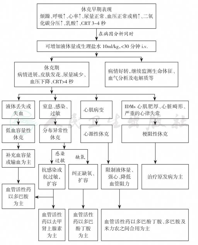 治疗原则:治疗原发病;纠正组织低灌注;保护重要脏器功能。代偿期主要以呼吸支持、输液为主,失代偿期加以纠正代谢紊乱、应用血管活性药物等。具体治疗详见新生儿休克诊疗流程图。