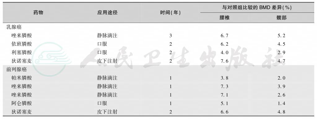 骨质疏松症是内分泌相关性肿瘤(如乳腺癌、前列腺癌等)治疗的重要并发症(治疗治疗引起的骨丢失,CTIBL),化疗引起卵巢功能衰竭、雌激素缺乏、骨质疏松症和骨折。CTIBL发生迅速而严重,例如,芳香化酶抑制剂所致的骨丢失量是绝经后骨质疏松症的2倍以上。