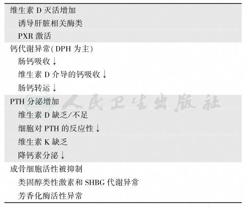 醋酸甲羟孕酮主要用于女性避孕,因能引起雌激素缺乏而导致骨质疏松症。应用该药后的第一年,骨丢失发生最快。各种AED类药物激活孕烷X受体(PXR),诱导灭活维生素D的关键酶CYP24。由于维生素D受体与孕烷X受体(PXR)的结构极为相似,因而,激活PXR将干扰维生素D的许多代谢效应:①提高骨的代谢转换率,促进骨丢失;对生长发育、免疫均有影响;②骨骼、肝脏、性腺、肾上腺、皮肤等组织在芳香化酶的作用下,将雄激素转换为雌激素;③诱导芳香化酶可引起维生素D代谢障碍,导致维生素D缺乏;④AEDs降低雄激素的生物可用性,增强类固醇类性激素的分解,升高SHBG,降低游离睾酮和DHEA水平;⑤诱导PTH分泌,同时抑制降钙素和骨钙素的合成与释放;⑥抑制成骨细胞增殖,并促进破骨细胞活性;⑦引起维生素K缺乏,骨钙素合成被抑制,并可诱发新生儿出血。