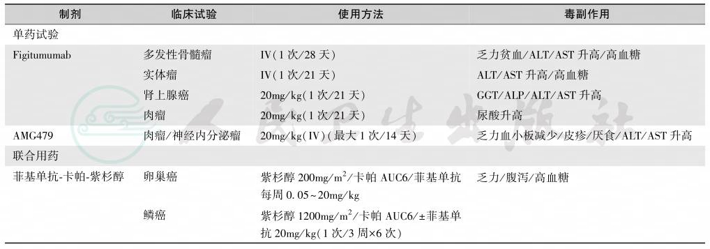 胰岛素样生长因子-1(IGF-1)受体抑制性单克隆抗体主要用于肉瘤、多发性骨髓瘤、卵巢癌、神经内分泌瘤和其他恶性肿瘤的治疗,由于IGF-1及其受体是调节骨生长发育、代谢的重要因素,因而可引起严重的骨质疏松症与骨折。目前该药应用不多,有关其对人体骨代谢的研究仍缺乏,初步资料主要来源于体外实验和动物模型。胰岛素样生长因子受体(IGFR)抑制性单克隆抗体的应用见表7,影响IGFR生物学效应的因素见表8。