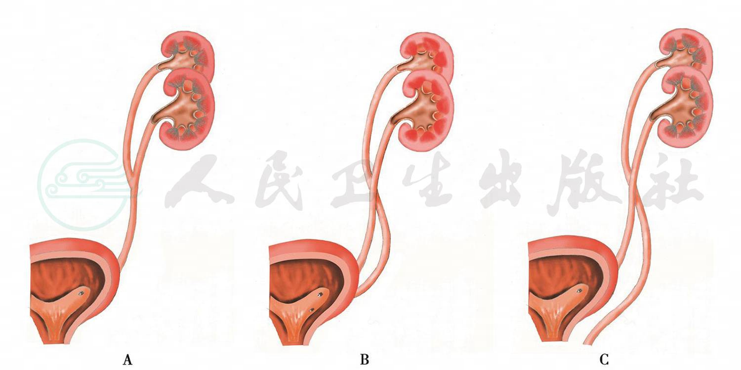 A.重复肾合并不完全型双输尿管;B.重复肾合并完全型双输尿管,双输尿管均开口于膀胱;C.重复肾合并完全型双输尿管,上位肾输尿管异位开口(图片由武汉大学人民医院王潇绘制)