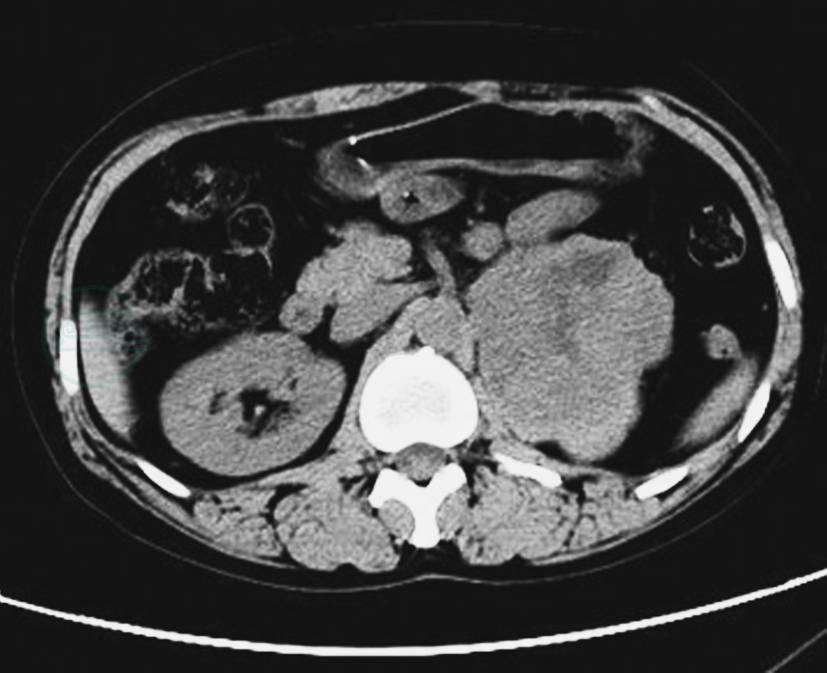 CT平扫示左侧肾上腺瘤体,形态不规则呈分叶状