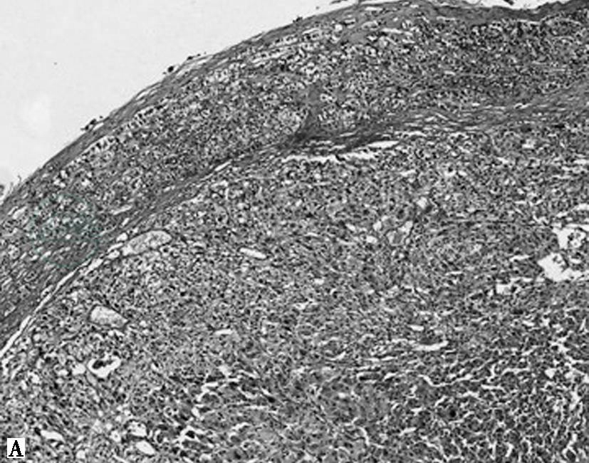 肾上腺嗜铬细胞瘤直径常小于100mm,多为30~50mm,呈圆形或椭圆形,极少数为哑铃型,有包膜,瘤体切面为黄白色至红棕色,暴露于空气中可变为黑色。嗜铬细胞瘤的名词来源于肿瘤组织浸润在铬盐(嗜铬反应)或其他弱氧化剂中发生的颜色变化。肿瘤内血管丰富,大的肿瘤常有出血、坏死、囊性变,钙化少见。巨检肿瘤与邻近肾上腺之间界限清楚,但显微镜下肿瘤与邻近肾上腺无真正的包膜,肾上腺通常受压或混合在肿瘤中。肿瘤可有纤维假包膜或扩展到肾上腺被膜中,邻近皮质的边缘可不规则,肿瘤细胞与皮质细胞混合性生长。显微镜下肿瘤呈特征性巢状(细胞球Zellballen)和/或梁状结构生长为主,亦可见到弥漫性或实性结构,细胞间富于血管。肿瘤细胞具有细颗粒状的嗜碱性或嗜双色性胞质,细胞核圆形或卵圆形,核仁明显,部分出现假包涵体结构。瘤细胞可有显著多形性,巨核及深染的细胞核常见。但和其他内分泌肿瘤一样,并非恶性的表现,肿瘤内亦可见孤立的神经节细胞(图1)。免疫组化嗜铬细胞瘤CgA阳性(图2),肿瘤中的支持细胞(位于细胞球周围)S-100蛋白阳性。恶性嗜铬细胞瘤的直径较良性肿瘤更大、坏死更多。但事实上除肿瘤出现转移(不包括肿瘤广泛或局部浸润到邻近器官或大血管,而必须出现在原来没有嗜铬组织的部位)外,并无可靠的形态学标志,没有一个组织学特征能作为独立指标确定肿瘤是否具有临床侵袭性行为。转移的主要部位常为肝脏、骨骼、淋巴结、肾和肺部。