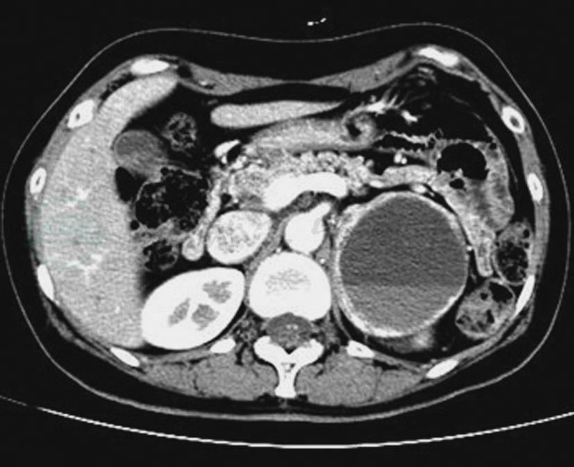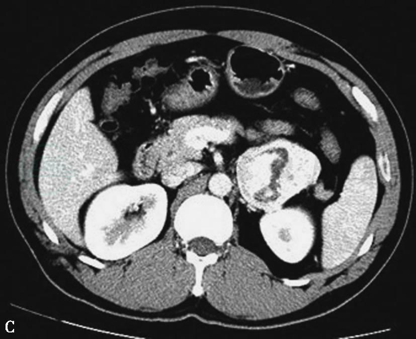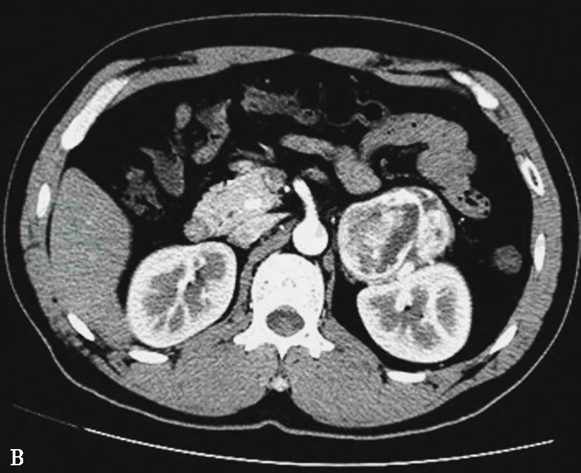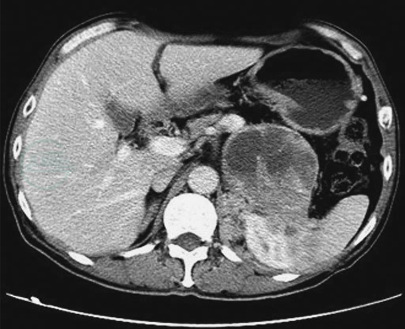 CT静脉期示左侧肾上腺瘤体,形态不规则,囊变坏死明显,瘤体侵犯肾脏、脾脏及膈肌脚等周围结构
