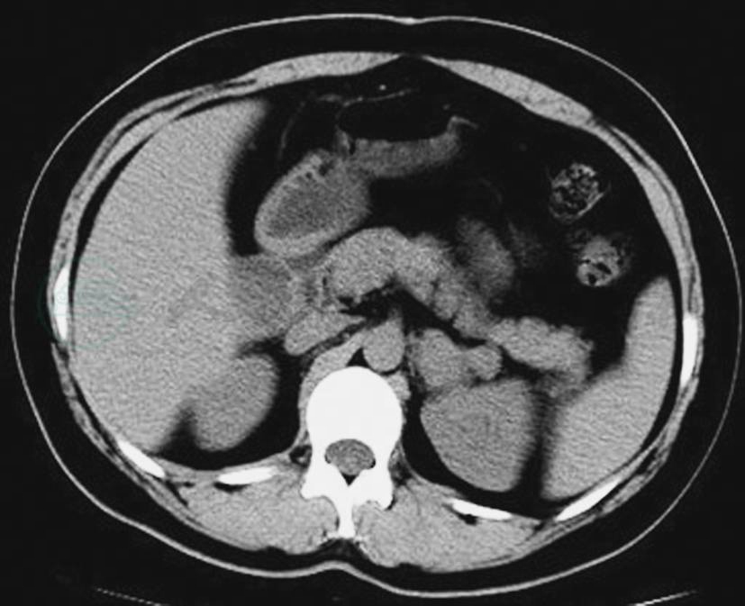 CT静脉期示瘤体呈中央-边缘坏死,坏死完全,呈厚壁囊状改变,内见液-液平面