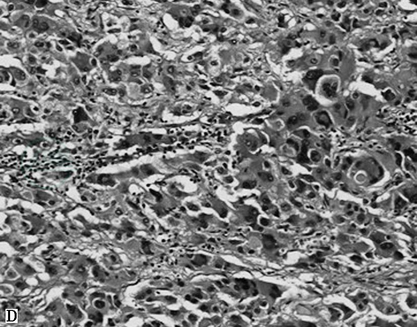 A.HE 60倍,肿瘤周围见受压的肾上腺皮质;B.HE 100倍,特征性巢状(Zellballen结构),周围包绕纤细的纤维血管性间质;C.HE 200倍,肿瘤细胞形状和大小变化大,嗜碱性或嗜双色性,核仁明显,可见细胞核假包涵体及胞质玻璃样小体;D.HE 200倍,肿瘤细胞多形性及核深染明显,可见胞质内透明小球