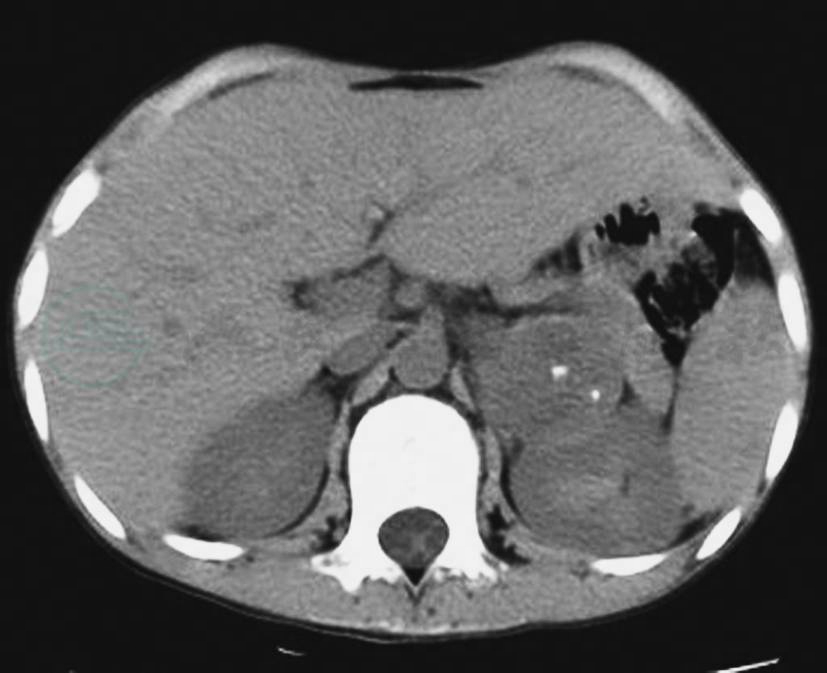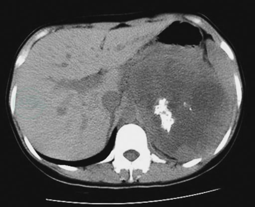 CT平扫示左侧肾上腺区圆形瘤体,内见颗粒状钙化灶