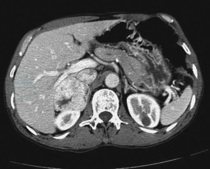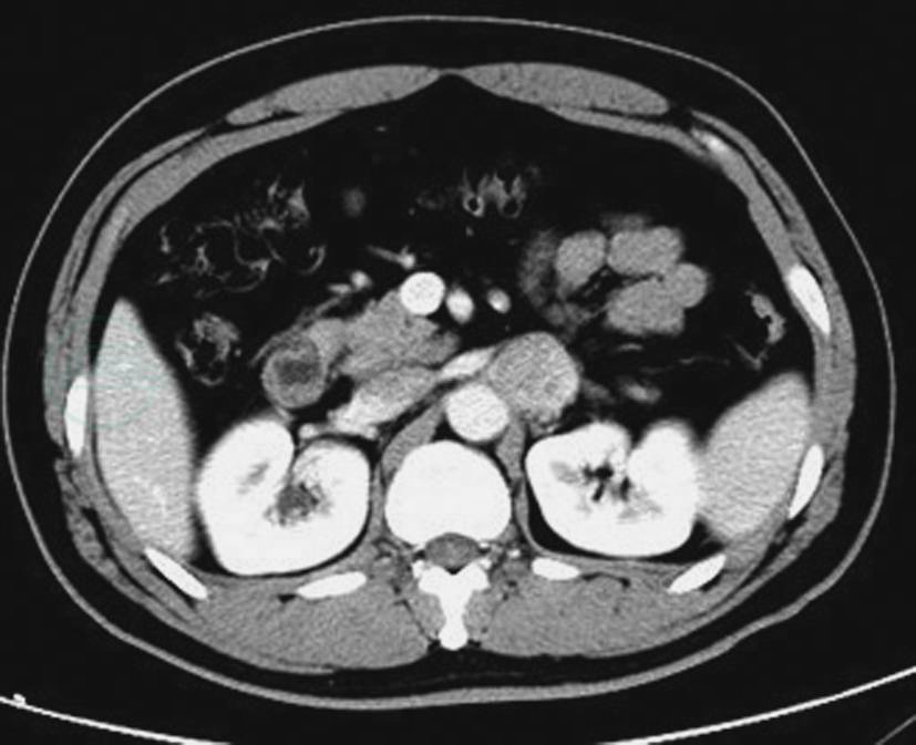CT增强扫描门脉期示右侧肾上腺明显强化瘤体,其内见裂隙状无强化坏死区