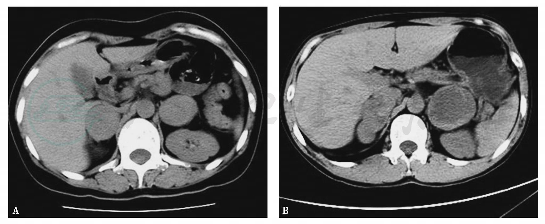 A.CT平扫示两侧肾上腺类圆形瘤体,密度尚均匀;B.CT平扫示两侧肾上腺瘤体,右侧瘤体不规则分叶状,左侧瘤体呈类圆形,其内囊变较明显