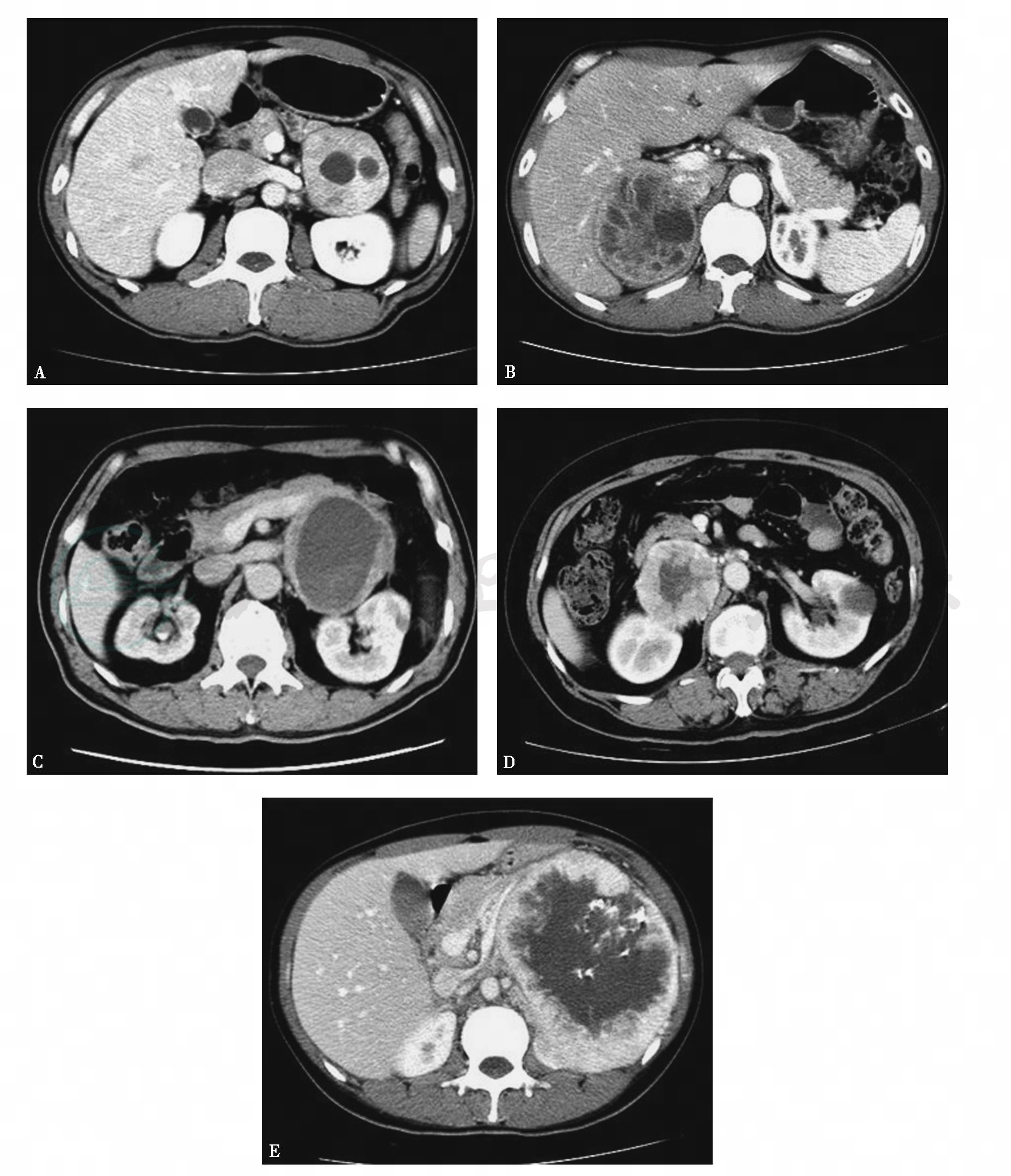 A~D.良性嗜铬细胞瘤不同形态及分布的坏死;E.左侧恶性嗜铬细胞瘤的伴中央-边缘坏死