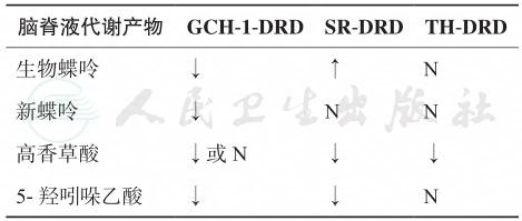 多巴胺代谢通路中不同酶的缺乏,导致代谢产物在脑脊液中发生不同的改变,完善脑脊液生物蝶呤等代谢产物的测定,对于鉴别哪种基因突变所致的DRD有一定的指导意义(表1)。