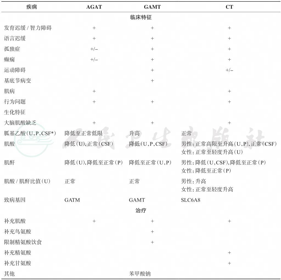诊断:临床医生在遇到无法解释的智力低下、惊厥及语言发育延迟的患儿时,都要想到有无本病的可能性,对智力障碍伴孤独症样行为的患儿应该筛查肌酸缺乏综合征,各亚型间的比较见表1。