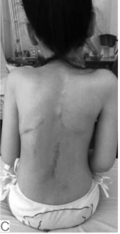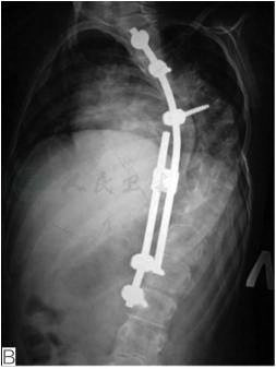 A.术前全脊柱正位片提示大C型胸弯;B.行单侧可撑开型脊柱内固定手术,术后全脊柱正侧位片提示侧凸部分矫正,躯干平衡尚可;C.术后外观照(引自Komolkin I, et al. Treatment of Scoliosis Associated With Arthrogryposis Multiplex Congenita. J Pediatr Orthop, 2017,37 Suppl 1:S24-S26.)