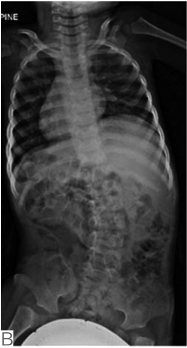 有研究报道,约20%~67%的先天性多发性关节挛缩症患者可出现脊柱侧凸。这类患者往往出生时就表现为脊柱畸形,反映出胎儿在母体宫内位置(图4)。在婴儿期脊柱侧凸进展很快,直至儿童后期才趋于稳定。大多数脊柱侧凸在5岁前可发现,对于肌发育不良及综合征型关节挛缩患者来说,胸弯及胸腰弯更多见,腰弯少见。对远端关节挛缩患者来说,胸腰弯更多见,此类患者侧凸进展比其他类型更快(图5)。