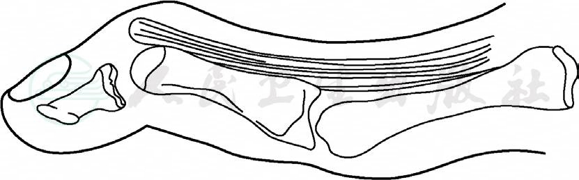 末节指骨骨折由于直接暴力引起的粉碎性骨折合并软组织破裂者较为多见,骨折移位少见。末节指骨基底部背侧伸指肌腱止点部易发生撕脱骨折。多由于手指伸直时,间接暴力作用于指端,使末节指骨突然屈曲,伸指肌腱骤然牵拉所致。如在接球时,指端被球撞击所致的末节指骨基底部背侧撕脱骨折。骨折后末节手指屈曲,呈典型的锤状指畸形(图1)。
