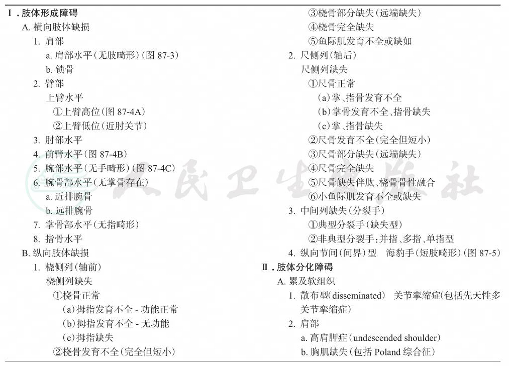 1951年O’Rahilly提出了长骨缺损的简单分类,主要包括缺损导致远端一定关节的所有结构缺失(终末缺损,terminal defect)和保留正常远端结构的节段性缺损(间介缺损,intercedlary defect)。随后 Franf和 O’Rahilly(1968 年)、Burfch(1966 年)进一步将其发展,在此基础上Swanson等(1968年)以畸形发生的机制,将其分为6个类型。国际假肢和矫形外科学会于1972年在Dundee和1974年在Montreux对这个分类和其他的分类方法进行了讨论。Swanson于1976年根据胚胎学发育障碍将上肢先天性畸形分为7类,并进行了详细的描述。并于1983年再次发表了对于其亚型详细描述的分类,从而形成了现今沿用的国际手外科学会联合会手部先天性畸形的分类(IFSSH分类)法(表1)。