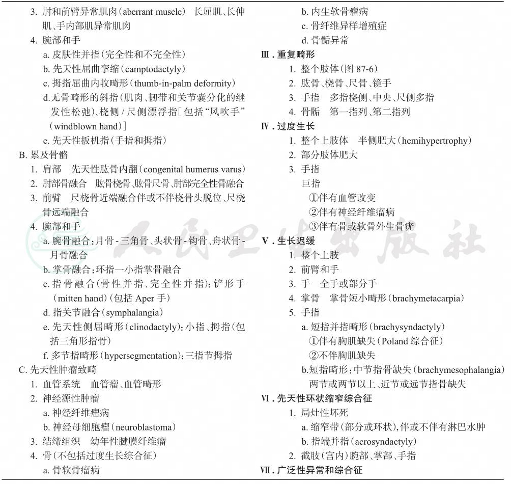 ②防止现有畸形的发展引起继发性骨关节畸形。如不等长的并指、末节骨桥并指、交叉并指伴手指远节发育不良、先天性缩窄带、三节指骨拇指的楔形中节指骨、影响手指发育的其他畸形等最好在6个月左右即手术。