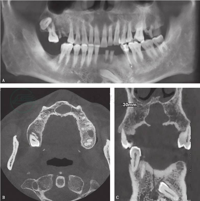 上颌骨CBCT,A.CBCT全景重建图;B.CBCT横断位;C.CBCT冠状位。示上颌切牙管异常扩大,呈类圆形囊腔,边缘清楚,周围见骨白线包绕