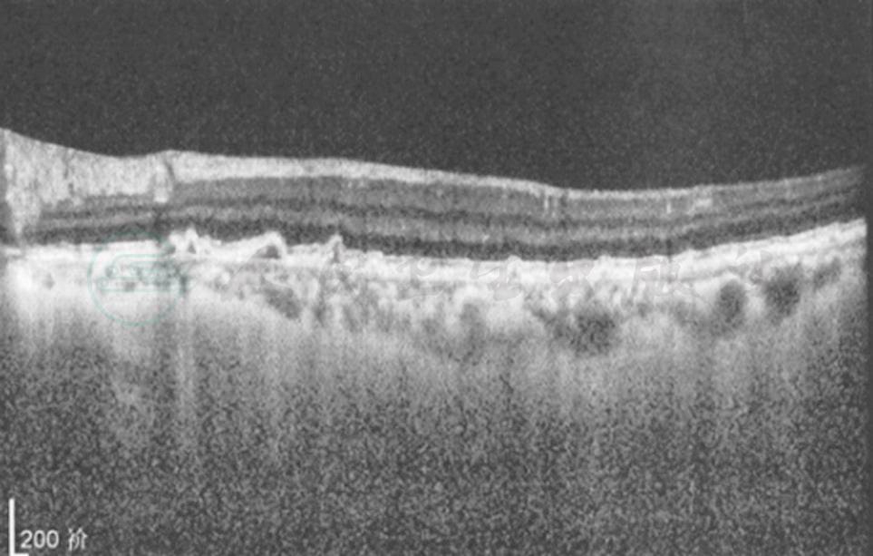 本病为非霍奇金B细胞大淋巴瘤,主要侵犯中枢神经系统与眼的玻璃体及视网膜。近年来发病明显增加,可能与AID病的发病率增加有关,但在我国还与我们对本病认识的提高相关。据复旦大学附属眼耳鼻喉科医院病例,发病年龄在41~84岁间,平均(55.69±12.55)岁。男女无明显差异,可能女性稍高。80%双眼受累。眼部症状往往先于神经系统症状,眼淋巴瘤患者最后85%发生中枢神经系统淋巴瘤,并是导致患者死亡的主要原因。先有中枢神经系统淋巴瘤的患者中,15%~25%以后将发生眼内淋巴瘤,也有两处同时发生的。原发性眼内淋巴瘤的主要症状为无痛性视力下降及飞蚊症。检查以表现单纯玻璃体炎者最多,达50%以上。玻璃体内可见簇状、片状或云雾样灰白色细胞浸润,周边部浓密,向中央渐稀疏,视网膜可无病变。其次为视网膜深层色素上皮下有黄白色、扁平的肿瘤浸润病灶,大小不一,可融合成片,视网膜病变可伴有或不伴玻璃体混浊。上述两种为眼内淋巴瘤的典型表现,非典型表现则多种多样。有沿血管旁浸润,有如树枝挂霜样血管炎;肿瘤侵犯视网膜表现为黄白色的视网膜坏死灶,如同急性视网膜坏死综合征表现;由于色素上皮遭破坏可出现渗出性视网膜脱离;少数情况下也有表现为孤立的眼内肿瘤;瘤细胞如侵犯视盘,则有类似视神经炎或视盘水肿的表现。极少数的情况下肿瘤可自行消退,原病灶处出现斑点状的色素上皮增生或去色素改变。眼前节可有角膜后KP、虹膜结节、房水细胞及闪辉征阳性,这些体征缺乏特异性,但虹膜无后粘连往往提示非葡萄膜炎症。辅助检查方面:B超显示局部球壁隆起或弥漫性球壁增厚,内反射呈低回声。荧光血管造影早期浸润病变呈低荧光,后期呈高荧光,可能伴有血管炎改变。OCT在色素上皮与Bruch膜间有高反射物质为其特征改变(图1)。