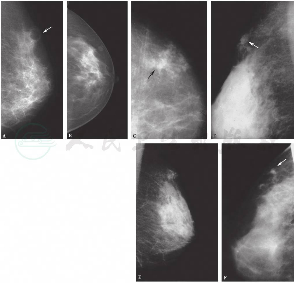 由于外伤引起的脂肪坏死,病变部位常位于腺体内或腺体外的浅表皮下脂肪层,病变切线位投照有利于鉴别诊断。对于其他原因导致的脂肪坏死,病变常位于腺体内及乳后间隙,由于病变与腺体重叠,常不易作出明确诊断。
