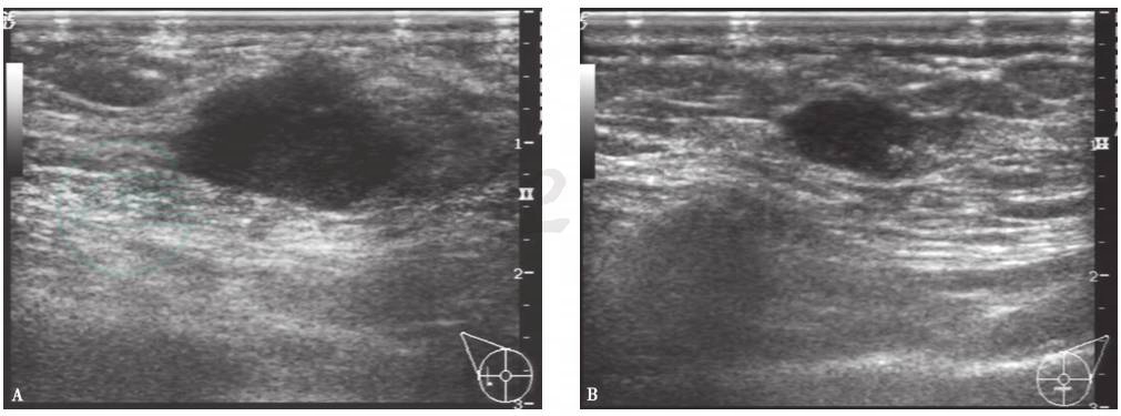 右侧乳腺外侧肿物呈低回声,形态不规整,边界不规则,呈蟹足样,后方回声衰减(A)。左侧乳腺中下方肿物,呈低回声,边缘不光滑(B)