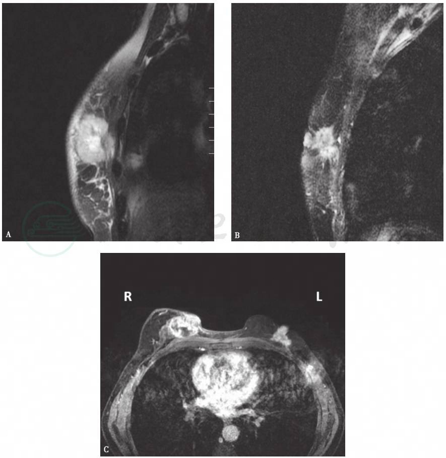 双侧乳腺内见不规则长T2信号肿物,右侧较大,增强扫描不均匀环形强化,右乳皮肤增厚,左乳头受累凹陷
