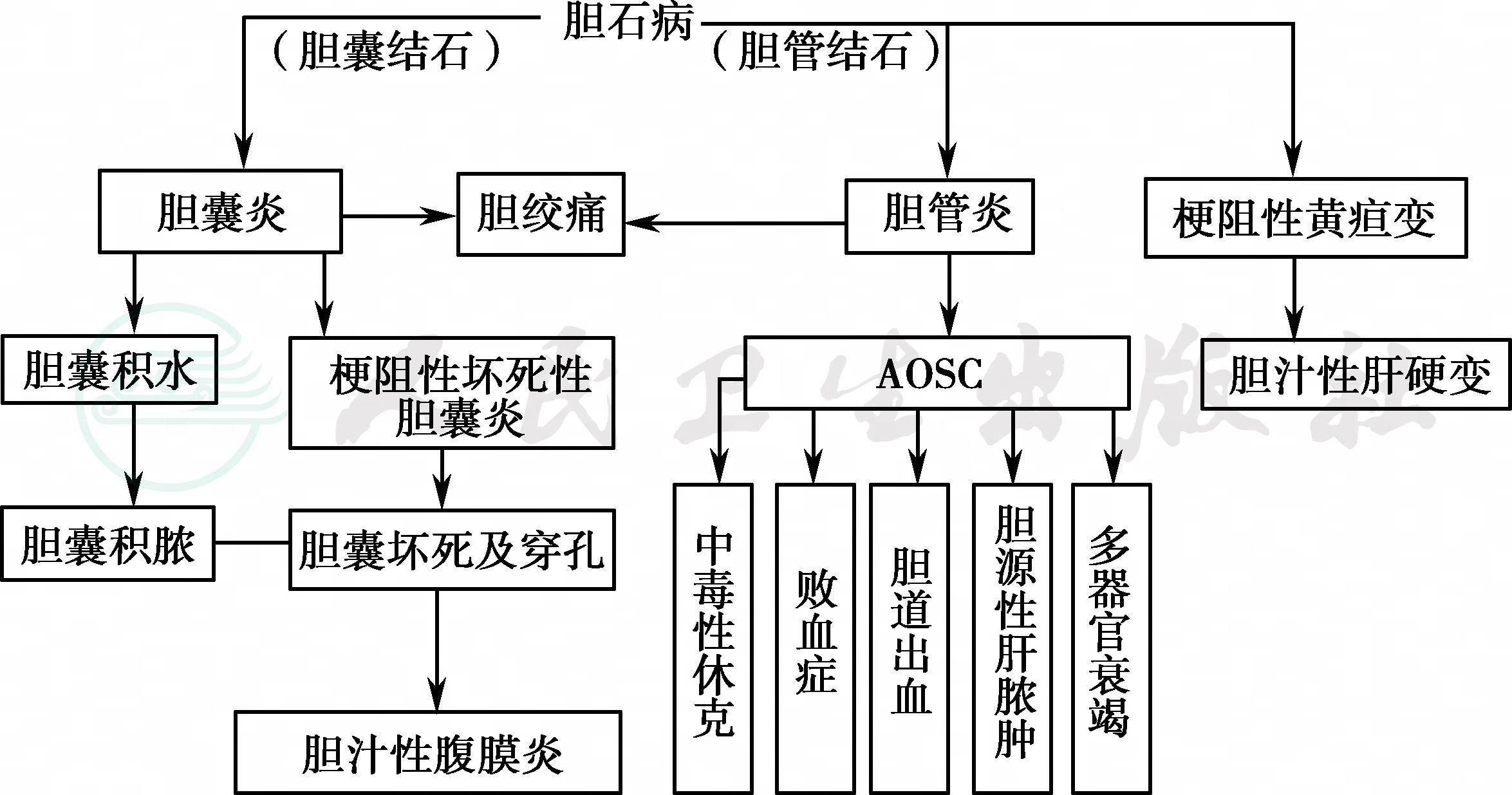 胆石症发生后,可引起胆道系统、肝脏以及全身一系列病理解剖及病理生理改变,主要有: