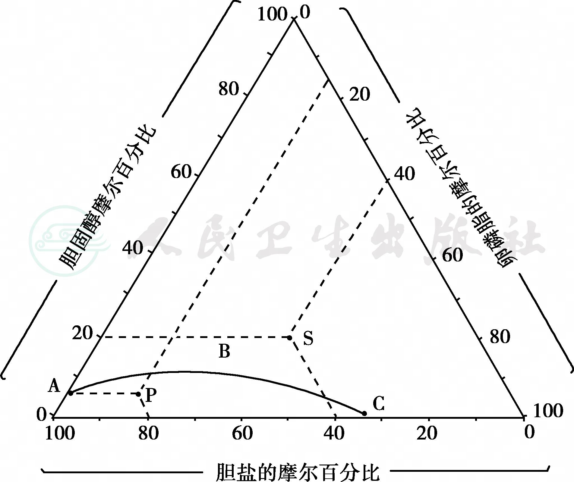 该类结石与胆固醇代谢障碍有关。种种原因使胆固醇含量增多和/或胆盐、卵磷脂减少,使胆固醇浓度相对增多,则胆固醇就会从胆汁中析出而形成结石。1968年Admirand和Small用三角坐标来表示胆汁中胆固醇、胆盐和卵磷脂的相互关系(图1)。三角坐标中的任何一点都同时反映3种物质在胆汁中的含量百分比(指其中一种物质占三种物质总含量的百分比)。正常胆汁的各点都应在三角坐标的曲线以下(图1A点),而胆固醇和混合结石患者的各点都在曲线上或曲线以上(图1B点)。