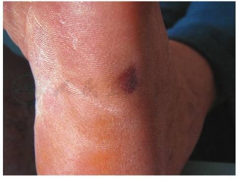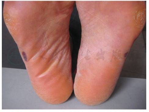 黑踵又称为跟部瘀点(calcaneal petechiae)。成群的黑色小点突然出现于一侧或两侧足跟的后缘,有时发生于趾端下方(图1,图2),可以扩大融合而易误诊为色素痣或黑素瘤,不引起压痛或疼痛。黑点是由于剧烈摩擦引起出血,通常发生于运动员,尤其足球、网球及篮球等运动员。在坚硬场地上奔跑摩擦、压迫尤其足跟与鞋底后部剧烈摩擦时,真皮乳头层的毛细血管破裂而出血,可随汗管进入表皮而达角质层,镜下可见肥厚的角质层内有成块的淡红色或棕色无定形物质,这是血液溶解后所形成的血块,多见于汗管附近。举重运动员的手掌后部偶然有相同的皮损。血小板减少性紫癜也有黑色斑点,但不限于足跟部位。
