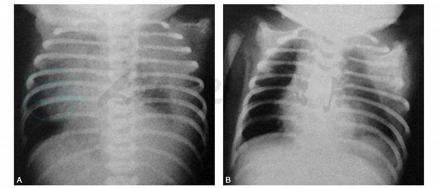 男性,25小时,足月顺产,生后5小时出现气急、发绀。A.胸部正位片示左侧胸腔一片致密,肋间隙增宽,纵隔右移明显;B.抽出约300ml乳糜状胸水后复查,左侧胸壁有条状致密影,左肺内中带有斑片状密度增高影