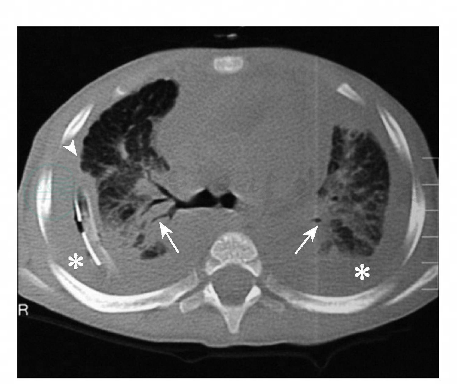 早发型胸片显示两肺透亮度减低,磨玻璃样改变,其内见弥漫性粗网状和/或结节密度增深影,系肺间质内扩张的淋巴管,管腔过度扩张则形成囊状,内有淋巴液淤滞。位于胸膜下间隙内过度扩张的淋巴管常可发生乳糜胸(图2),因此对新生儿期难治性胸水应考虑肺淋巴管扩张症。扩张淋巴管周围的肺泡因受压而有代偿性过度充气。晚发型发病前胸片正常,发病后两肺呈弥漫性间质性病变,可见Kerley B线。