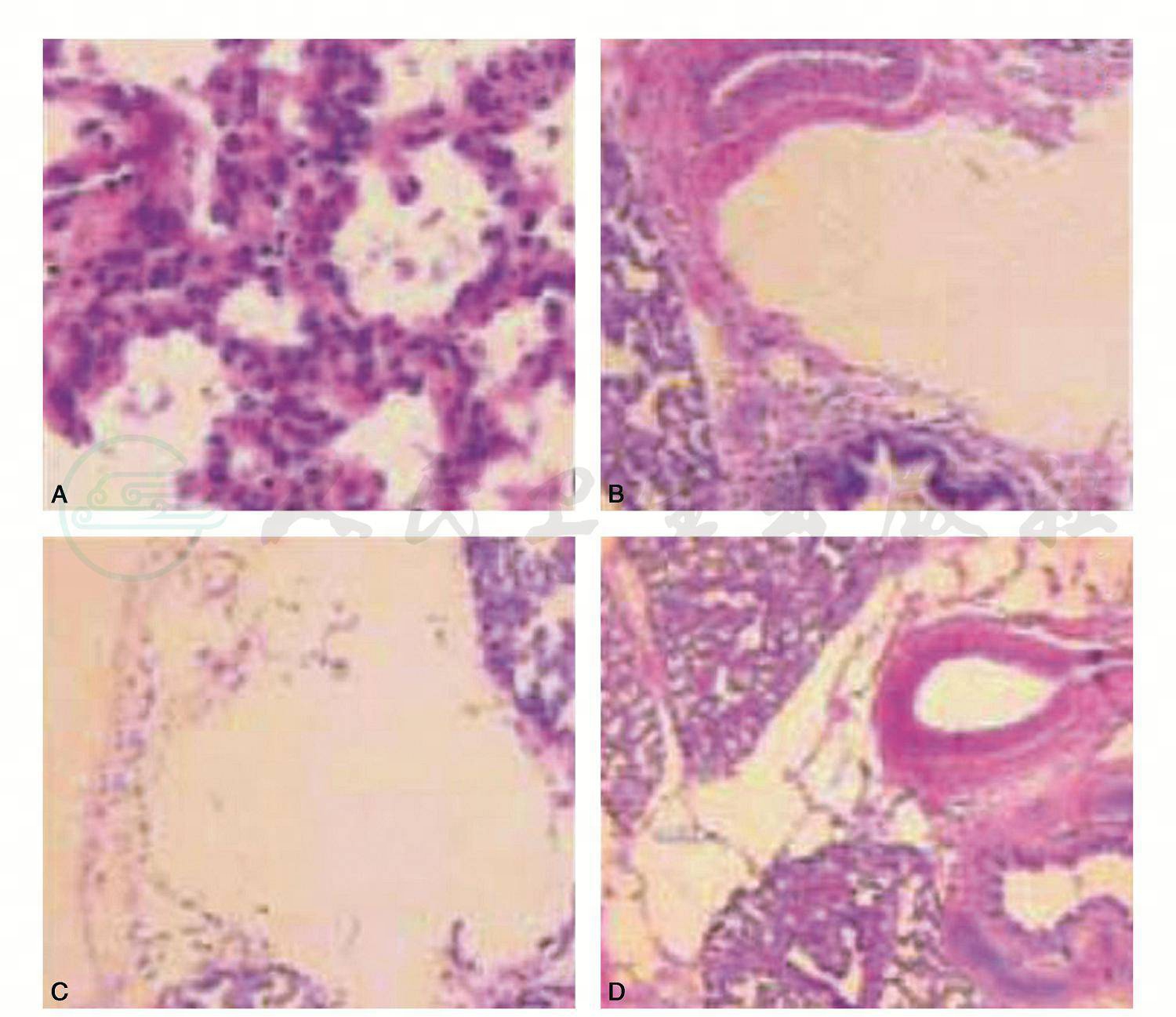 病理上肉眼见肺体积增大,表面有网眼状的微小囊泡样病变,切面上从胸膜下至肺实质可见多数的小囊腔。镜下见胸膜下、小叶间及支气管、血管周围结缔组织内淋巴管数日增多,且有不同程度扩张,其内壁被覆一层扁平上皮,腔内充满淋巴液,周围的肺泡受压(图1)。