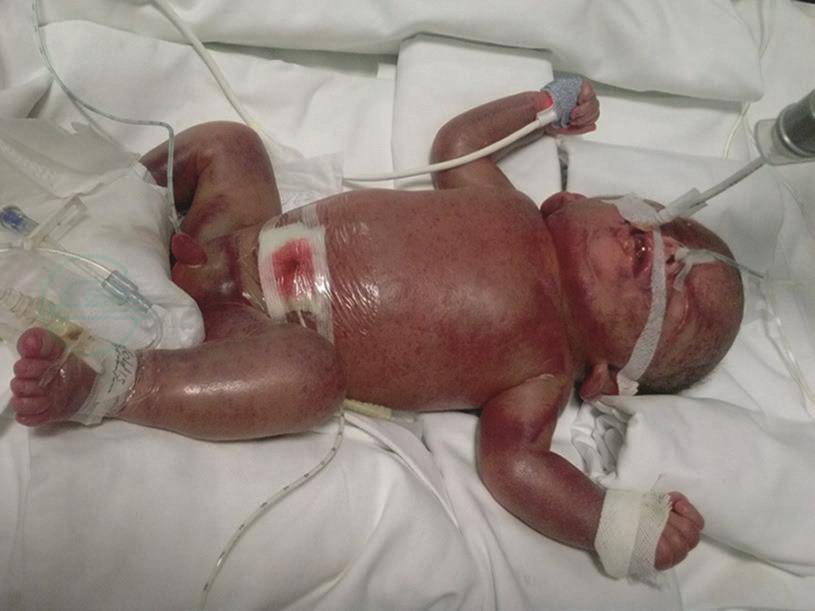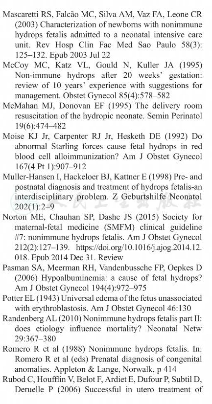 胎儿水肿的出生后管理对新生儿医生也是挑战。分娩后的治疗取决于患儿的原发疾病。新生儿复苏需要熟练的团队(新生儿医生、护士、呼吸治疗师、放射和超声技师)以及恰当的复苏设备(McMahan and Donovan 1995;American Heart Association 2006)。在新生儿复苏室可能需要立即的胸腔穿刺,心包穿刺或腹腔穿刺治疗,保证患儿的正常的呼吸循环功能。脐动静脉置管监测和治疗动脉血压、血气分析异常、静脉压、红细胞比容和代谢异常。与母亲交叉配血的红细胞悬液或全血可用来部分换血,矫正新生儿严重的贫血,甚至是因为非免疫性因素引起的胎儿水肿。肺表面活性物质和机械通气治疗肺表面活性物质的缺乏和肺发育不全,这些症状可能与水肿相关。新生儿输液量需要应用估计的体重(干重)(例如采用胎龄的第50百分位的体重)并且限制液体(如40~60ml/kg/d)直到水肿消退。血管活性药物的支持(如多巴胺)提高患儿的心输出量(Mascaretti et al. 2003;Teixeira et al. 2008)。