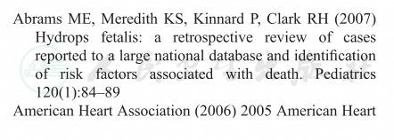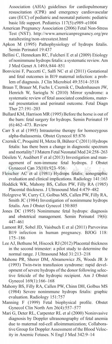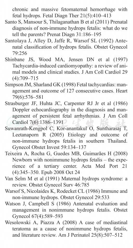HF死亡率高,准确诊断后才可以开始正确的治疗。父母双方都需要参与,因为HF的相关异常是严重的,甚至是致死的。此外侵入性的胎儿检查和选择性的早产存有异议。所以需要妇产科医生,胎儿医学和新生儿专家团队会诊,选择最佳的分娩时机,团队中还需要包括儿外科医生,心血管医生和心血管外科医生。文献中对HF的治疗有不同的方法,但是没有设计合理的临床试验给临床医生提供足够循证医学的依据。HF可能会自行消失。但是治理主要集中在矫正潜在的病理生理学问题,包括胎儿输血来纠正贫血(无论何种病因),药物治疗心律失常,纠正或降低体腔占位性因素,缓解心脏静脉回流或淋巴回流,或者采用措施停止胎儿的血液流失(无论何种病因)(Watson and Campbell 1986;Muller-Hansen et al. 1998;Jones 1995)。