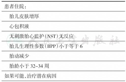 合并有HF的孕妇,如果产前无刺激胎心监护(nonstress test,NST)和胎儿生物物理特征(biophysical profile,BPP)异常,应该收治在三级医院(表3)。住院后继续确定HF的病因。34周后可以分娩。羊水穿刺显示胎儿肺部成熟,或者胎儿病情恶化,都是提早分娩的指征。如果有产科适应证或母亲因为镜像综合征出现病情变差,也需要及时分娩(Van Selm et al. 1991;Norton et al. 2015)。