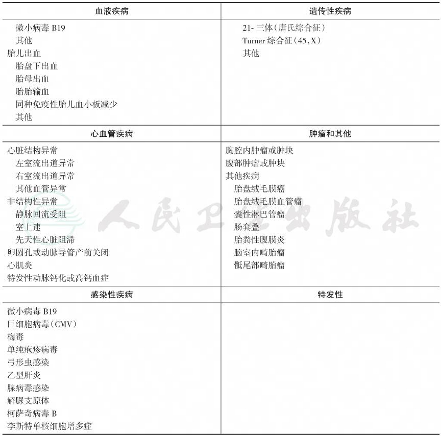 尽管我们已经知道免疫性水肿的病因,但是在出生前后进一步研究NIHF,提高我们对其病因的认识。大型的临床病例研究和系统综述报道产前将近 60% 的 NIHF 能找到病因(Santo et al. 2011),加上新生儿期进一步检查,85%的NIHF能发现病因(Bellini et al. 2009)。HF 是各种病因造成的非特异性的终末状态。它的病因可以分为6大类:血液疾病、心血管疾病、感染疾病、遗传异常、肿瘤和特发性。表1总结HF的病因。
