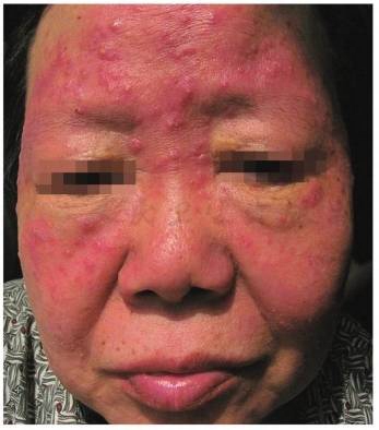 酒渣鼻样结核疹可见若干红色或淡青红色丘疹散布于面部,通常发生于颊部、前额及颈部,几乎不或完全不发生于鼻部(图1),也不发生角膜炎及脓疱,因而和酒渣鼻有所不同,用玻片按压时显示狼疮结节,组织变化主要为上皮样细胞浸润,毛囊附近常有淋巴细胞,也可有少数巨细胞。皮损自然消退后遗留小瘢痕。